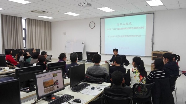 为增强广大师生科学消费、节约资源和环境保护意识,提高师生保护自身消费权益的能力,强化合理合法消费观念,学院下发了《关于开展2016年“3.15”国际消费者权益宣传咨询服务月活动的通知》要求,信息工程系积极响应,组织全系教职工于2016年3月14日下午在C1-Ⅱ113机房开展了学习活动,大家一起学习了新《消费者权益保障法》,并针对平时消费中遇到的问题和维权经历进行了讨论交流。
