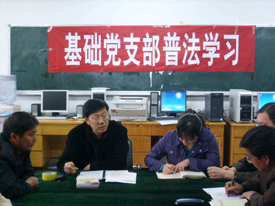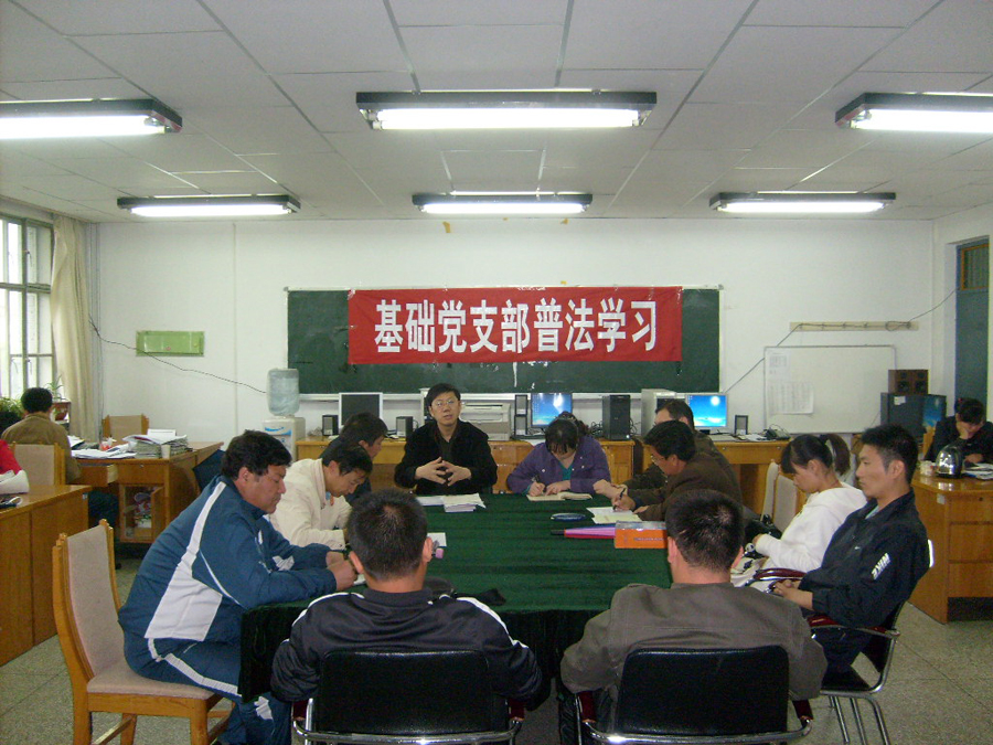 2009年5月25日下午,基础党支部在教务楼三楼语文、数学办公室组织开展了“五五普法”专题学习宣传会。会议由基础教学部党支部书记、系主任黄杰主持,系部全体教师参加了会议。